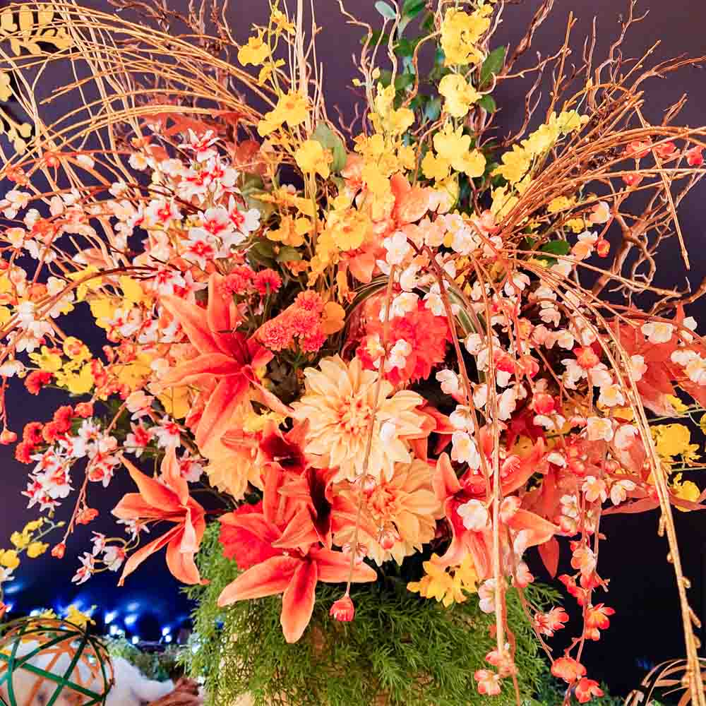 イエローオレンジ系の華やかで明るい冬のアレンジです。