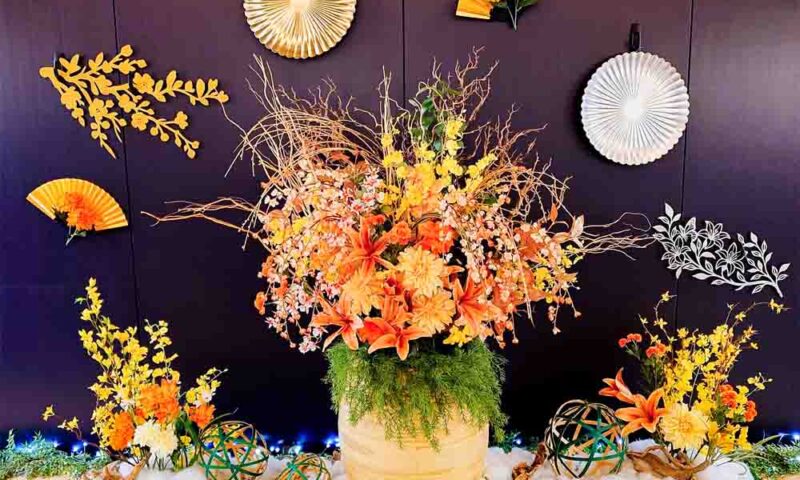大型のメインアレンジや流木、竹の毬などを散らしています。