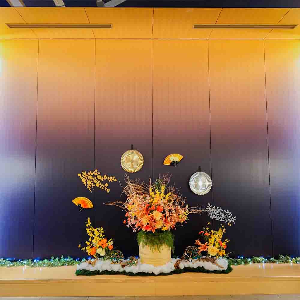 菊紋プレートや花の形に切り抜かれた金属プレート、扇などを壁面に貼り付け、
