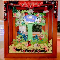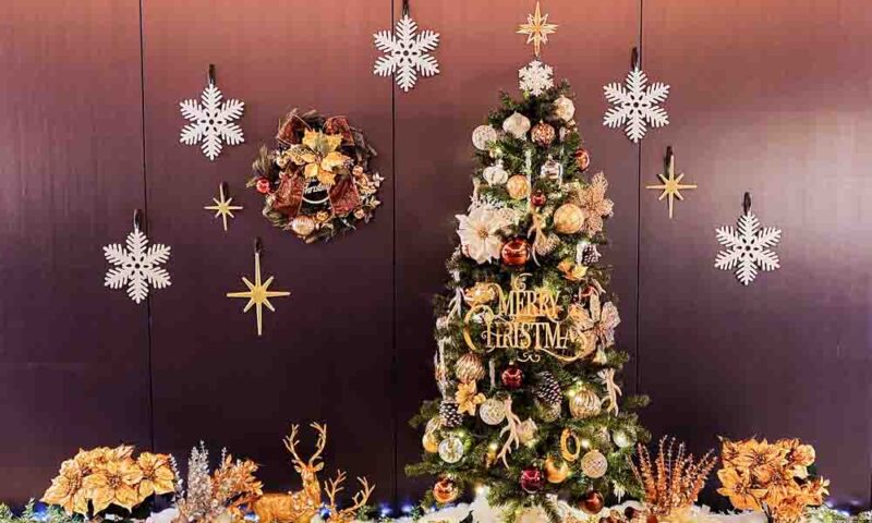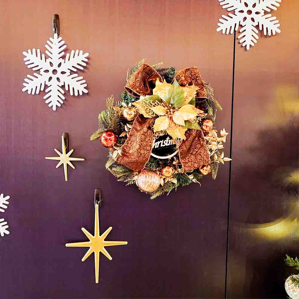 180cmのツリーとリース、壁面の雪の結晶と金属プレートのデザインです。
