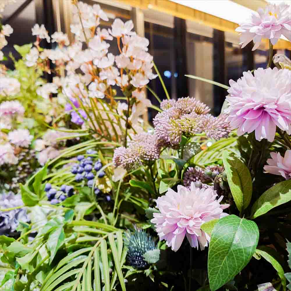 春の桜の淡いピンク色に、スモーキーパープル、グレイッシュトーンの実のものとハイドレンジアをカラーコントロールとして添えています。