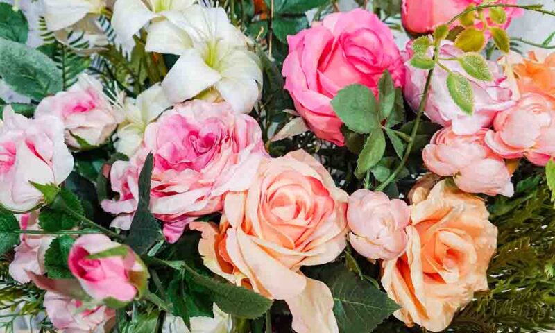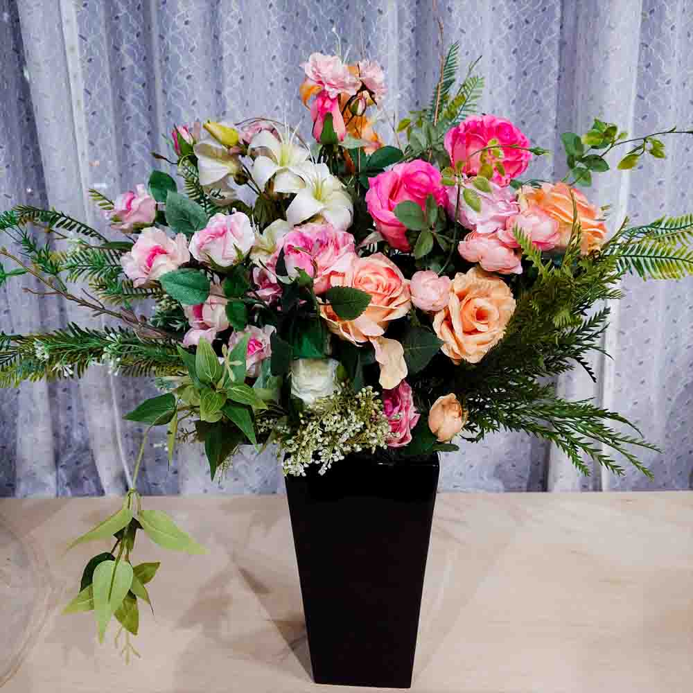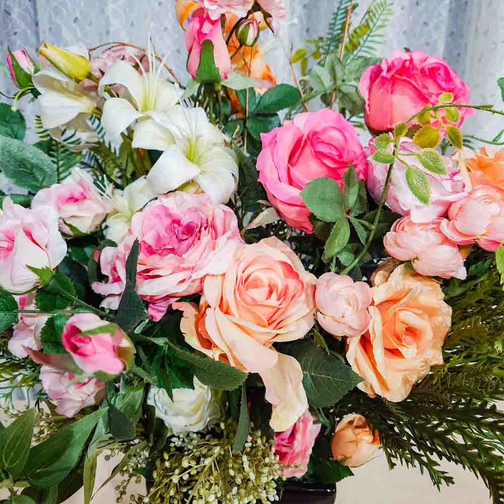 飾り棚用の春のフラワーアレンジを薔薇メインで作成しました。