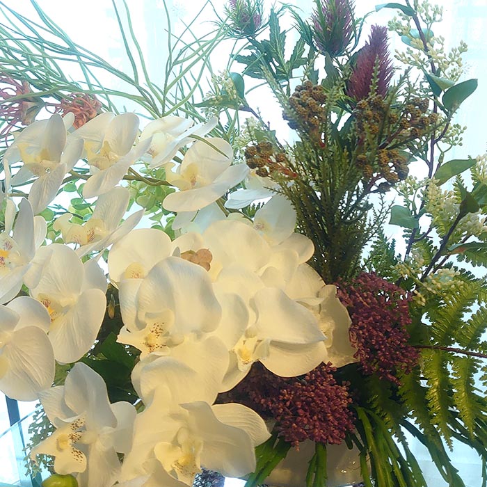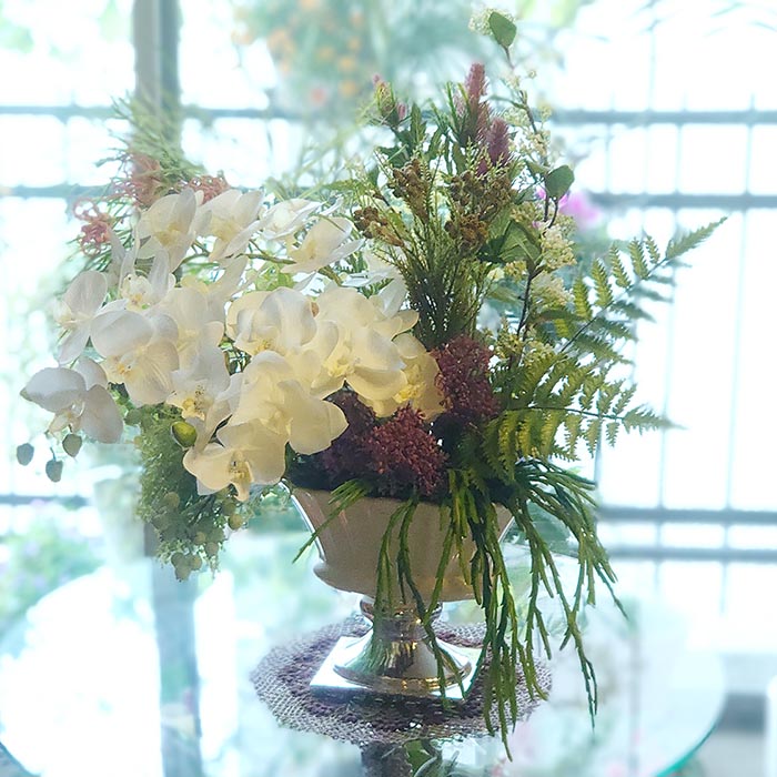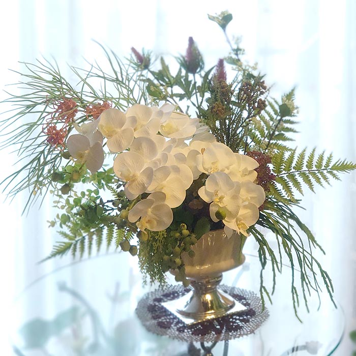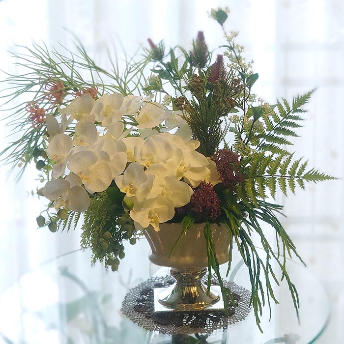クオリティ高いアーティフィシャルフラワーの胡蝶蘭をメインに細かな葉や実や枝などを組み合わせてアレンジ。足付きの陶器で高級感があり祝い花に最適です。