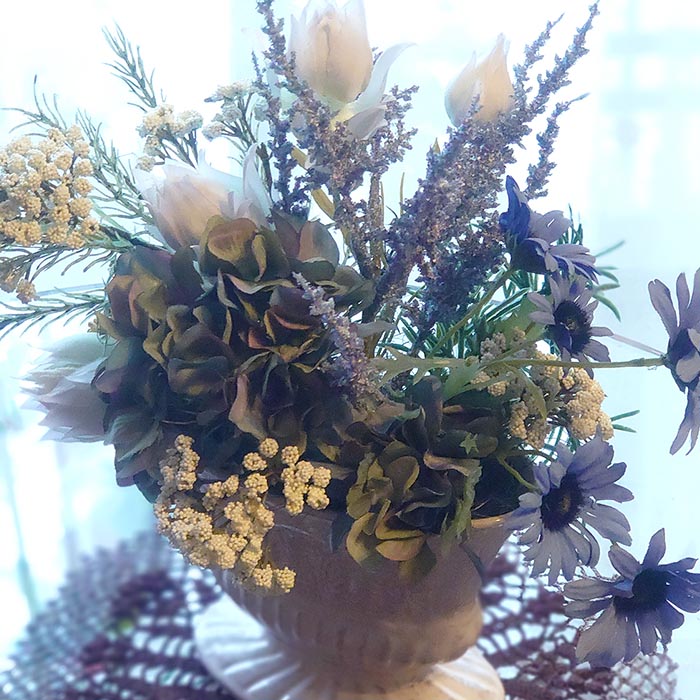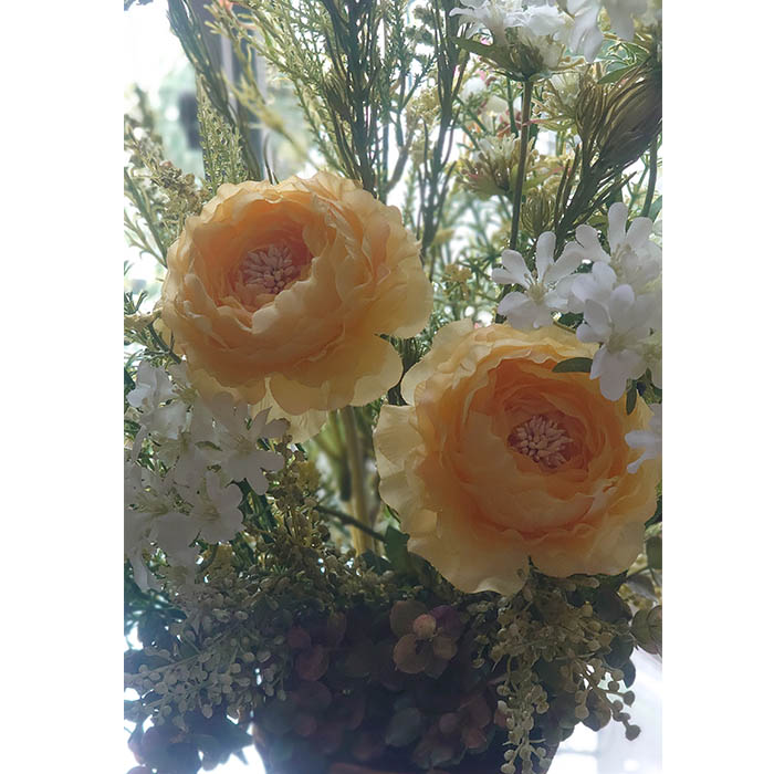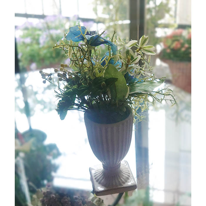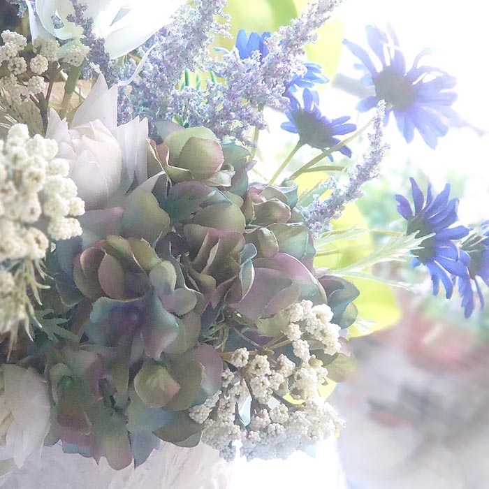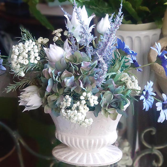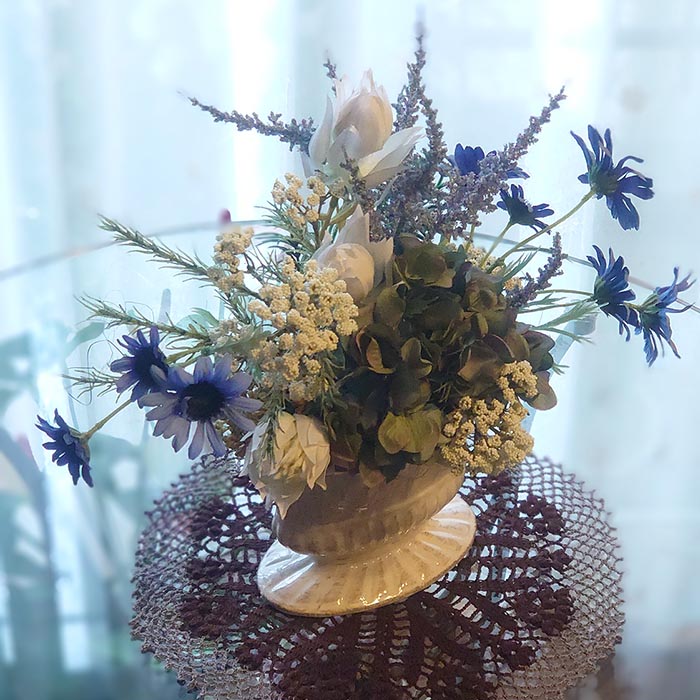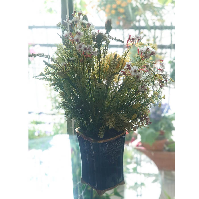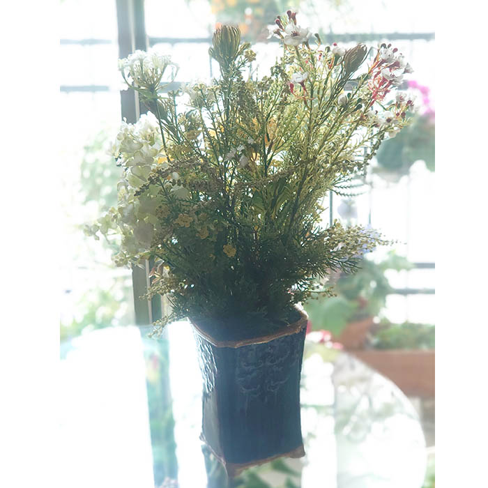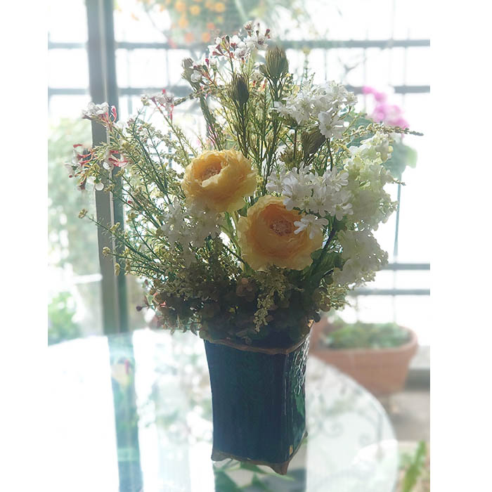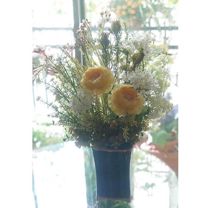深い海の色のブルーに縁取りの金が美しいレリーフ入りの陶器に、まるで朝摘みのガーデンフラワーを入れたような、イエロー×ホワイト×グリーンのフレッシュなアレンジです。細かな葉や実のもので、よりリアルに仕上げました。