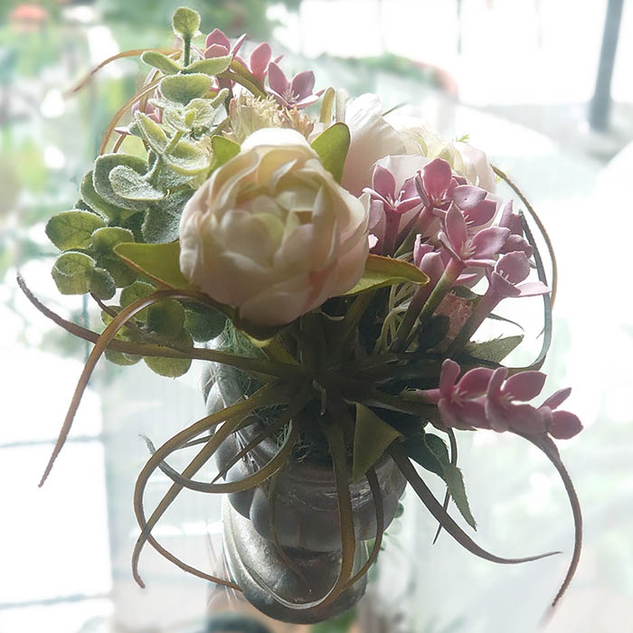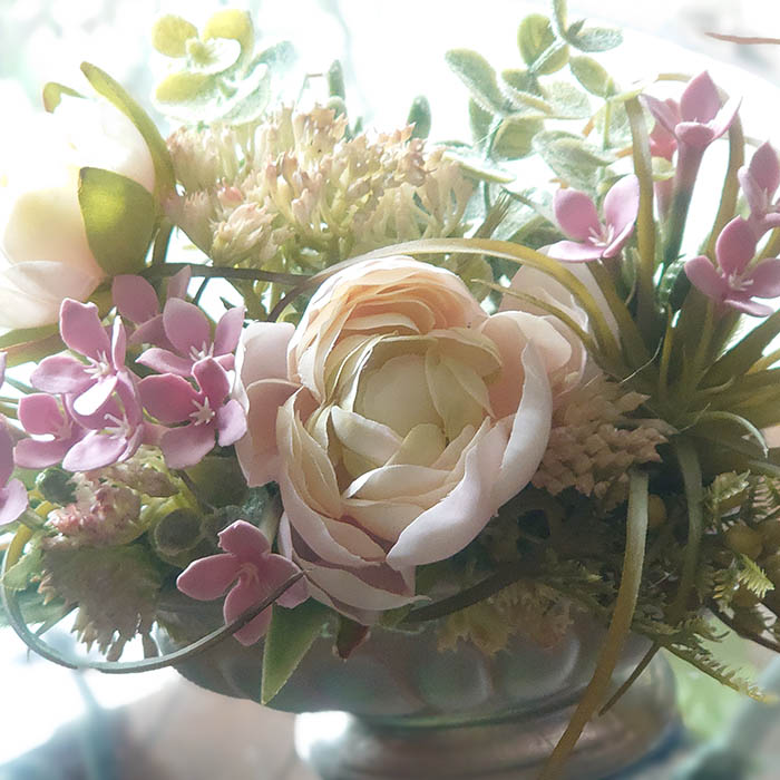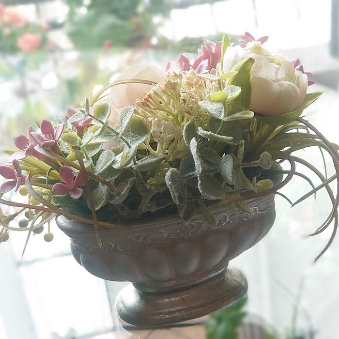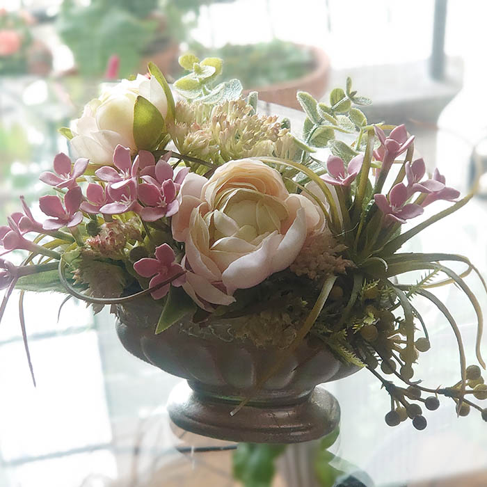 アンティークシルバーの足つきヨーロピアンの陶器に淡いピンクのラナンキュラスとピンク系の小花をあしらいました。小ぶりのサイズ感ですが花や実、エアプランツなど様々な素材が入っており大変クオリティ高い商品です。