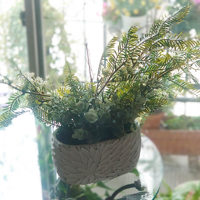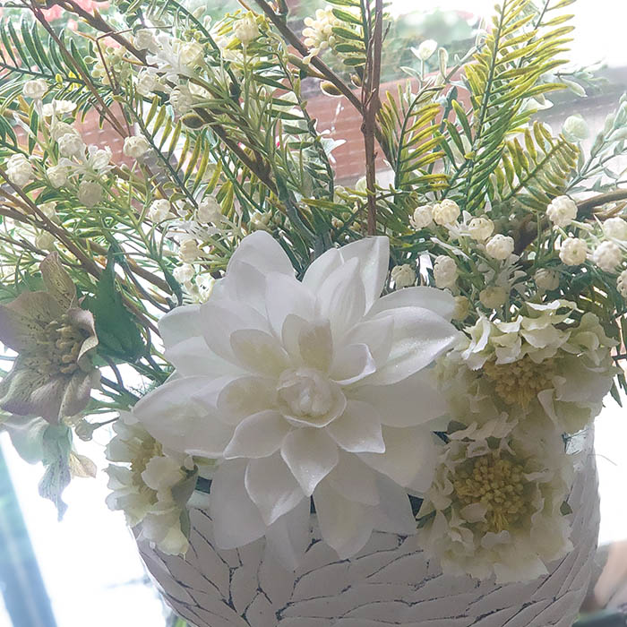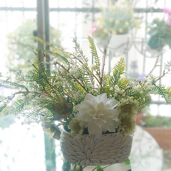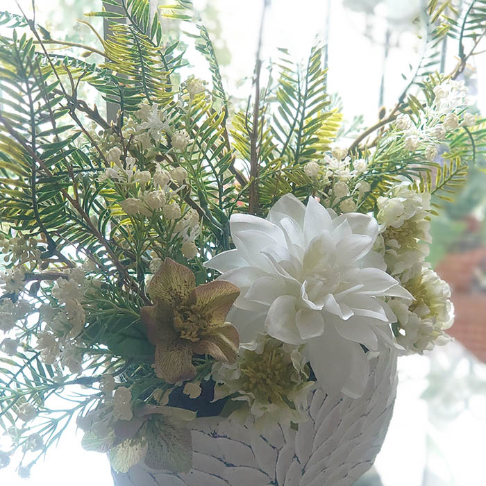 うっすらラメの入ったピュアホワイトのダリアに、フレッシュグリーンや小花をちりばめたナチュラルテイストのアレンジです。器はセメントで出来た重厚感のあるもので、ダリアの花が大きく彫られています。