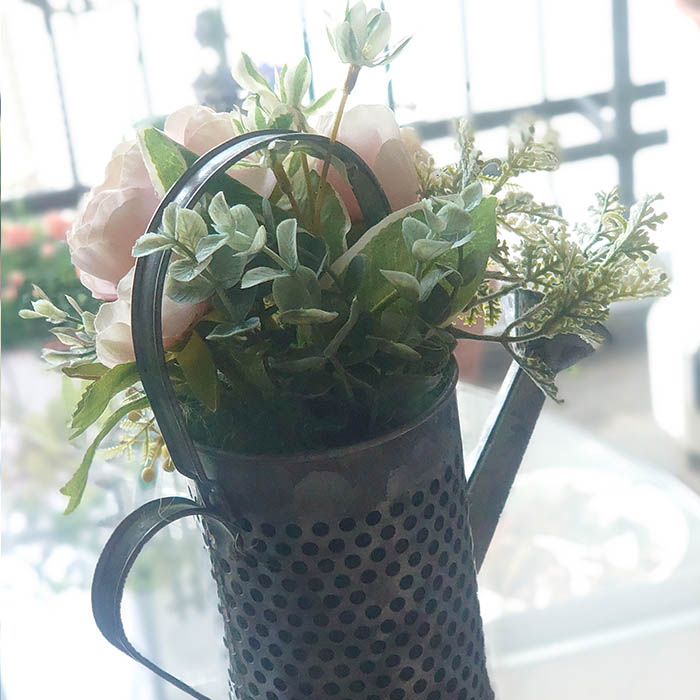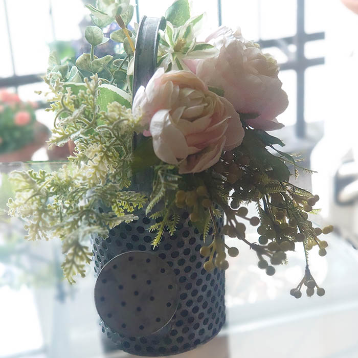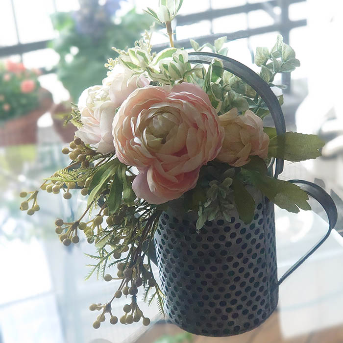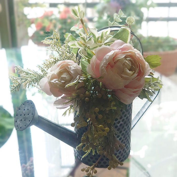 ブリキのジョーロに淡いピンクのラナンキュラスと実やグリーンを垂らしたナチュラルアレンジ。麻ひもをつけて吊るしてもかわいいです。側面は穴が開いていて透けるので、緑色のヤシ繊維を敷いて固定材が見えないようになっています。