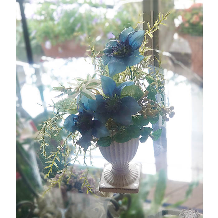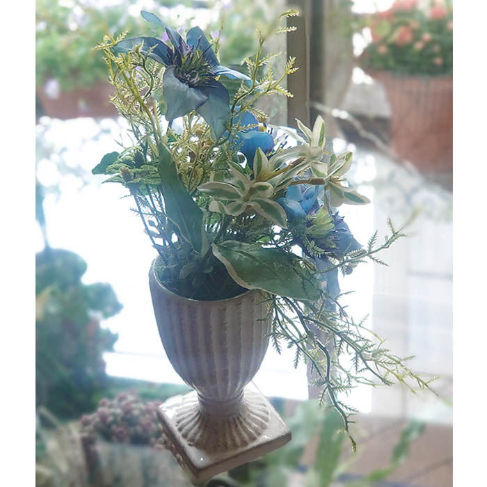 涼し気なブルーのクレマチスのアレンジです。うっすらベージュの足つきの陶器にクレマチスをライン上に配置し清楚なイメージです。ちょっとしたスペースに小型でもクオリティの良い物で目を引きます。